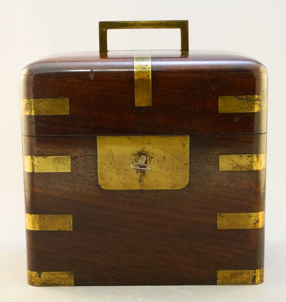 Antique mahogany and brass locking chest with integrated handle with key, 7" wide.