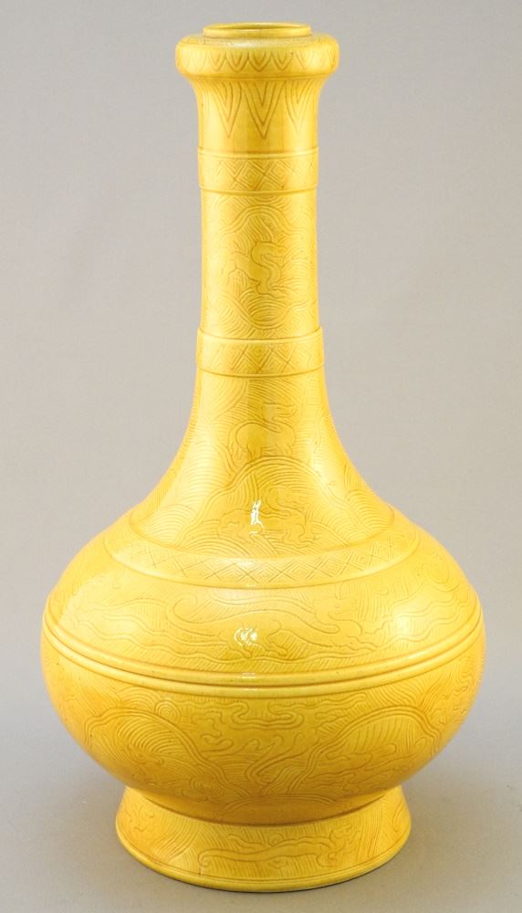 LOT 232 Kangxi Style Yellow Glazed Bottle Vase, 11 1/4" high. Estimate: $150 - $300 Sold For: $190 Auction Date: Tuesday, October 26 2021 at 6:00 PM