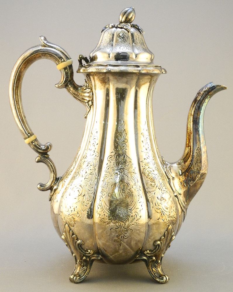 Antique Sheffield Plated Coffee Pot, Cream & Sugar.