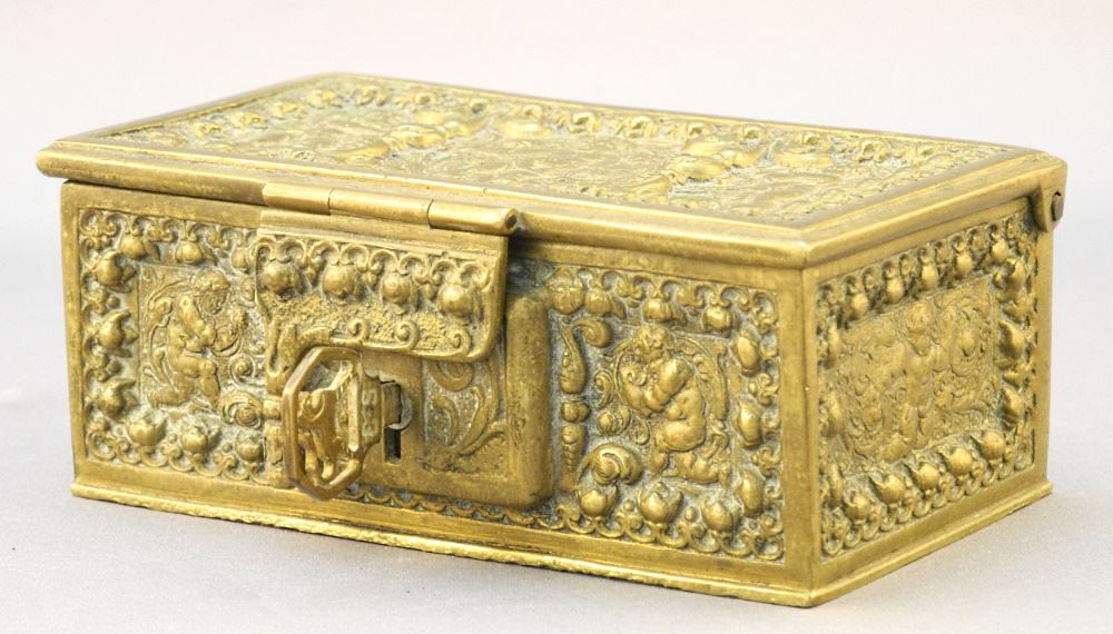 LOT 53 Cast Brass Renaissance Revival Casket with Key, 1 5/8" x 4 1/8" x 2 3/8". Estimate: $50 - $70 Sold For: $50 Auction Date: Tuesday, August 09 2022 at 6:00 PM