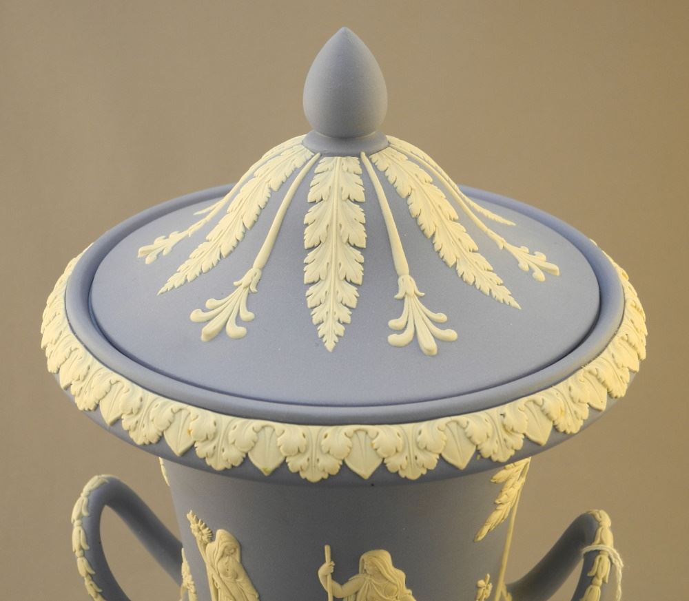 Pair of Wedgwood Pale Blue Jasper Ware Covered Urns.