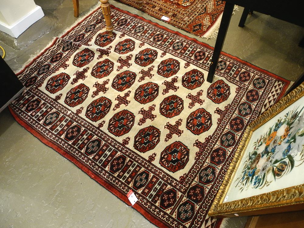 Afghan Ivory Brown Bokhara Pattern Carpet, Approximately 5'5" x 4'.