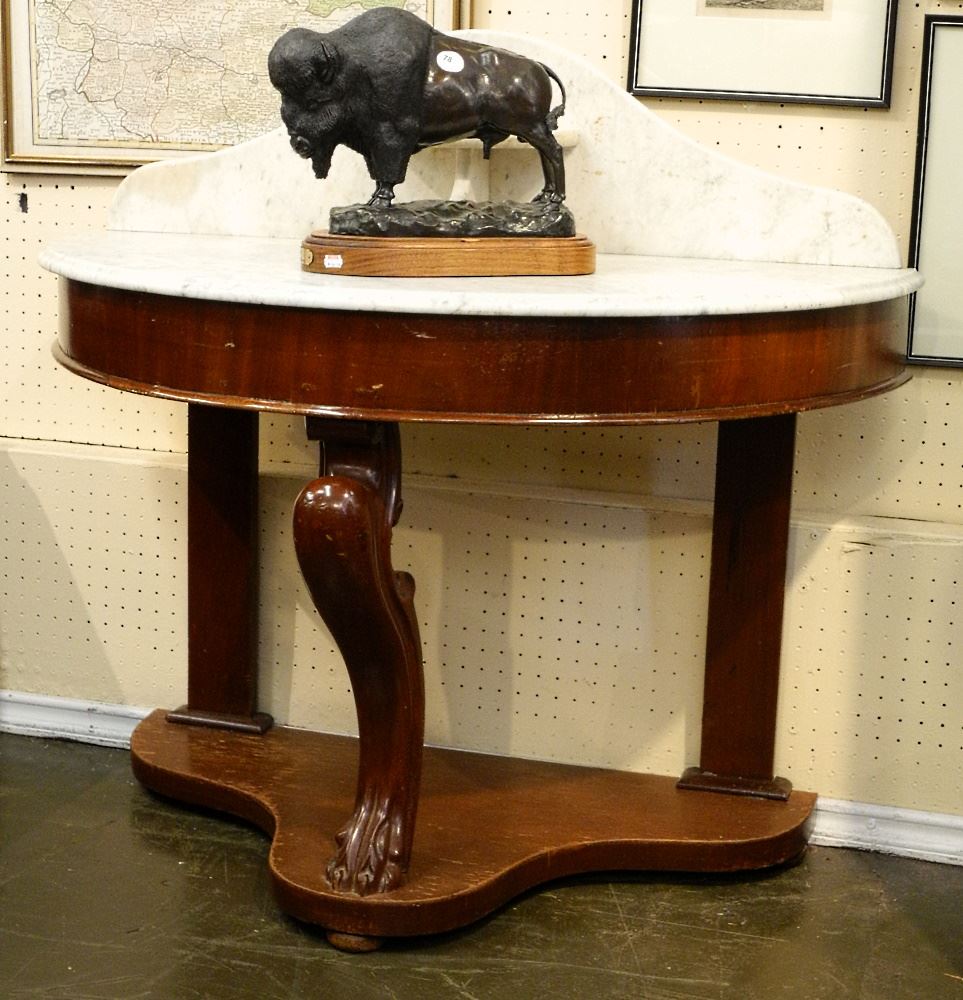 LOT 79 Marble Top Demilune Table, 42" Wide. Estimate: $150 - $250 Sold For: $120 Auction Date: Tuesday, August 09 2022 at 6:00 PM