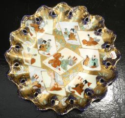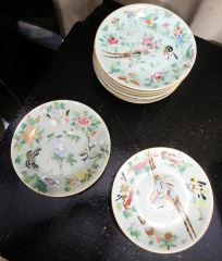 Asian Pierced Porcelain Plate (11") & 9 Celedon Plates, 7 1/2".
