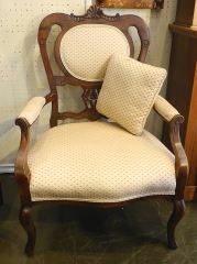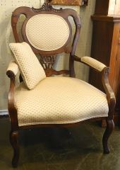 LOT 18 Edwardian Mahogany Freshly Upholstered Cameo Back Open Arm Chair with Cushion. Estimate: $50 - $100 Auction Date: Tuesday, April 09 2024 at 4:00 PM