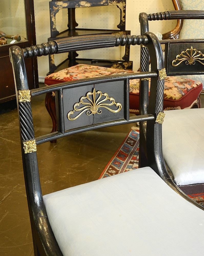 LOT 242 Set of 6 Regency Ebonized Mahogany & Brass Dining Chairs, 32 1/8"H. Estimate: $100 - $200 Sold For: $130 Auction Date: Tuesday, April 09 2024 at 4:00 PM