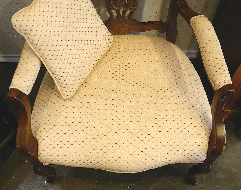 LOT 18 Edwardian Mahogany Freshly Upholstered Cameo Back Open Arm Chair with Cushion. Estimate: $50 - $100 Auction Date: Tuesday, April 09 2024 at 4:00 PM