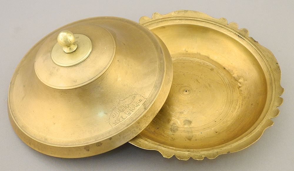 Arabic Bronze-Tone Covered Dish, Dated Hijri 1274, 7 1/4" Diameter.