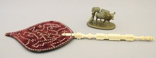 LOT 162 South Asian Carved Bone Fan (13 1/2"H) & Advertisement & Bull Card Holder, 2 7/8"W. Estimate: $50 - $100 Sold For: $35 Auction Date: Tuesday, April 09 2024 at 4:00 PM