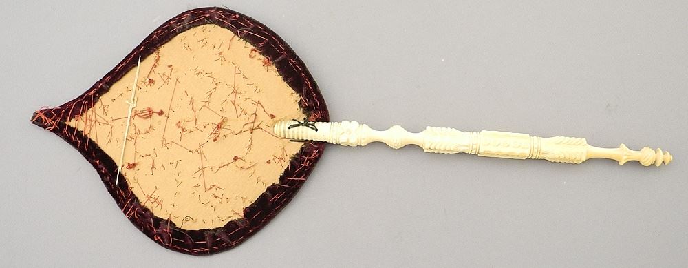 South Asian Carved Bone Fan (13 1/2"H) & Advertisement & Bull Card Holder, 2 7/8"W.