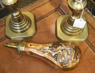 LOT 318 Pair of 10 1/2" Victorian Brass Candlesticks & James Dixon Powder Flash. Estimate: $50 - $80 Sold For: $45 Auction Date: Tuesday, April 09 2024 at 4:00 PM