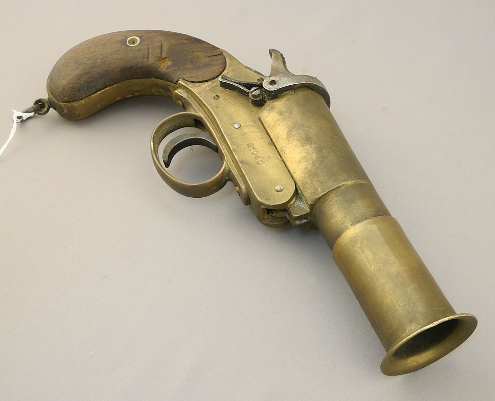 LOT 293 Webley & Scott Mark III Brass Flare Pistol, 1918, 9 1/2"L. Estimate: $400 - $700 Sold For: $200 Auction Date: Tuesday, April 09 2024 at 4:00 PM