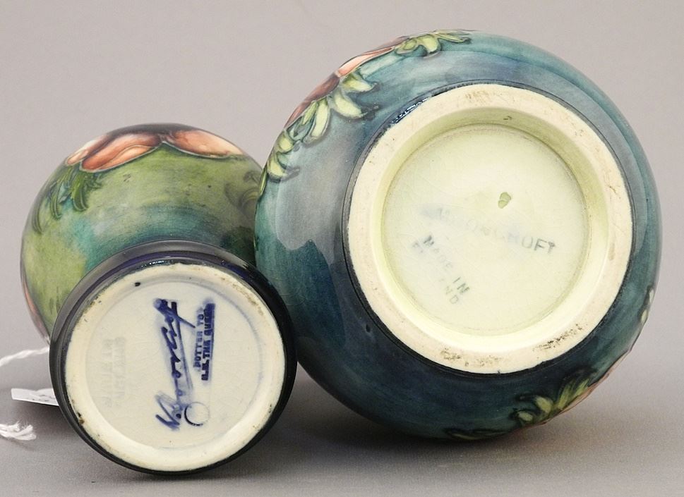 2 Moorcroft Anemone Vases: Baluster (4"), Squat, 3 1/2"H.