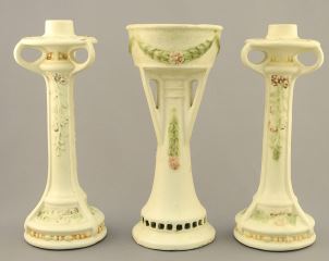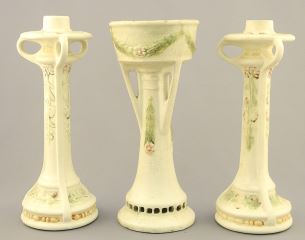 LOT 153 3 Pcs. of Weller Pottery: Pair of Candlesticks (9 1/4"H) & Vase (9 1/8"H) (crazing noted). Estimate: $60 - $100 Sold For: $30 Auction Date: Tuesday, April 09 2024 at 4:00 PM
