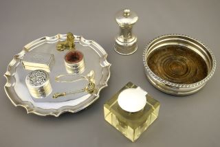LOT 277 Plated Items: 8" Salver, Pepper, Match Holders, Inkwell, etc. Estimate: $50 - $100 Sold For: $110 Auction Date: Tuesday, April 09 2024 at 4:00 PM