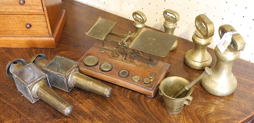 Nine pc Antique Brass & Copper; Bell Weights / Scales / Lamp / Bed Warmer