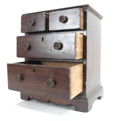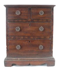LOT 100 Mahogany & Pine Apprentice Chest, 13 x 10 3/4 x 7 1/2" (base of bottom drawer signed). Estimate: $200 - $300 Sold For: $170 Auction Date: Tuesday, February 10 2026 at 4:00 PM