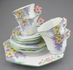 LOT 121 Melba Bone China Flower Handle Luncheon Set, "Lilac Time", 13 Piece Estimate: $50 - $100 Sold For: $50 Auction Date: Tuesday, February 10 2026 at 4:00 PM