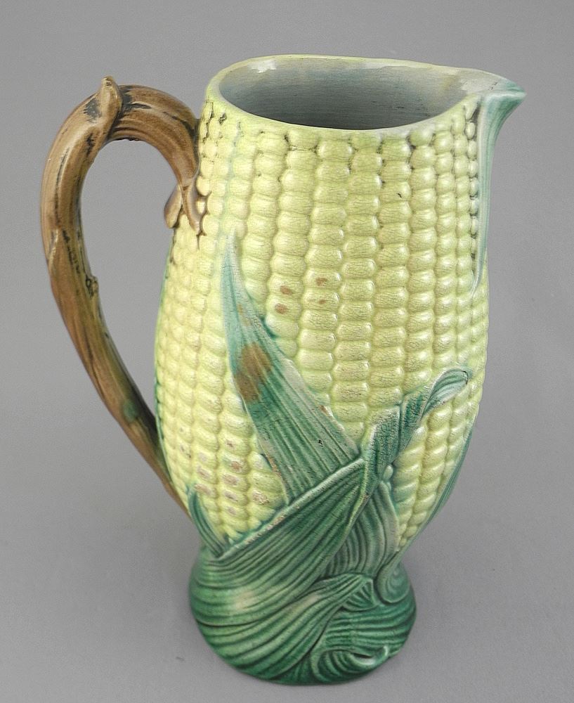 19th C. English Majolica "Corn" Pitcher with Registration Mark, 7 1/2"h.
