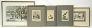 LOT 316 Five Engravings: Thanksgiving/J. Leach/Birds 1787/Lord Lionel, Largest 10 x 14 1/4". Estimate: $50 - $100 Sold For: $45 Auction Date: Tuesday, February 10 2026 at 4:00 PM