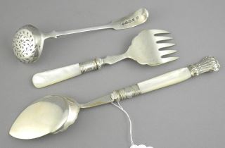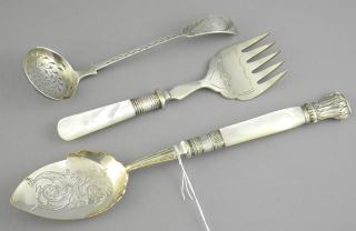LOT 321 Hallmarked Sterling Sifter Spoon (JW & Co.) & Mother of Pearl Serving Pieces. Estimate: $60 - $120 Auction Date: Tuesday, February 10 2026 at 4:00 PM