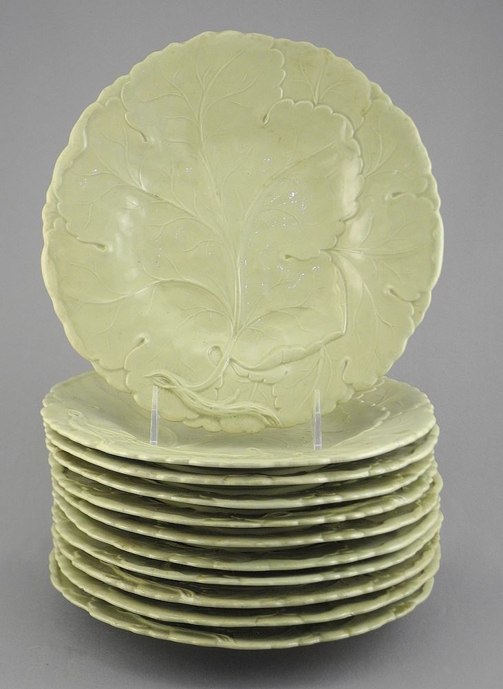Collection of Cabbage Leaf & Fern Pattern Earthenware Dishes, 9 1/4 - 11 1/4" (nibbled).