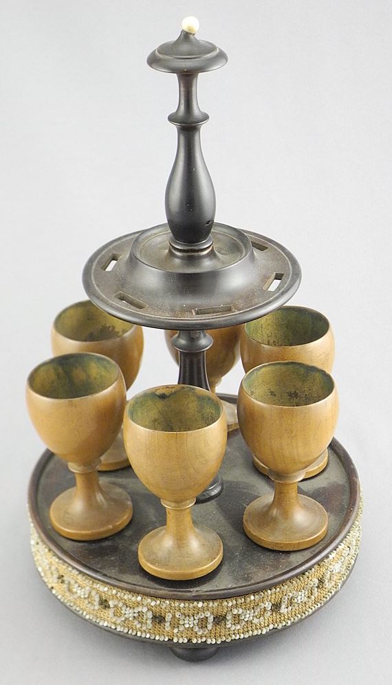 Treen Ware Egg Stand with Beaded Skirt, 10 1/4"h.