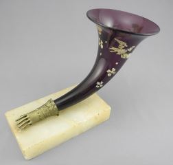 LOT 24 19th C. Enameled Amethyst Glass & Brass Hand Vase on Marble Plinth, 8 3/4"h (chip noted). Estimate: $50 - $70 Auction Date: Tuesday, February 10 2026 at 4:00 PM