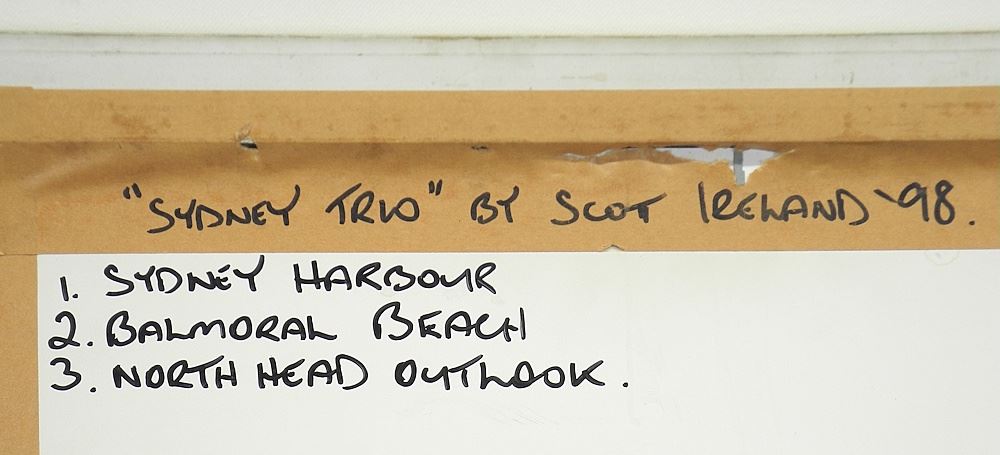 Gouache Triptych signed & Monogrammed S. (Scott) Ireland, Each 3 3/4 x 10 3/4", "Australi