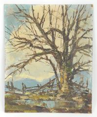LOT 294 Oil on Masonite signed R.A. (Rudolph Anton) Messner, 11 3/4 x 9 1/2", "Old Fence and Tree". Estimate: $60 - $100 Sold For: $30 Auction Date: Tuesday, February 10 2026 at 4:00 PM