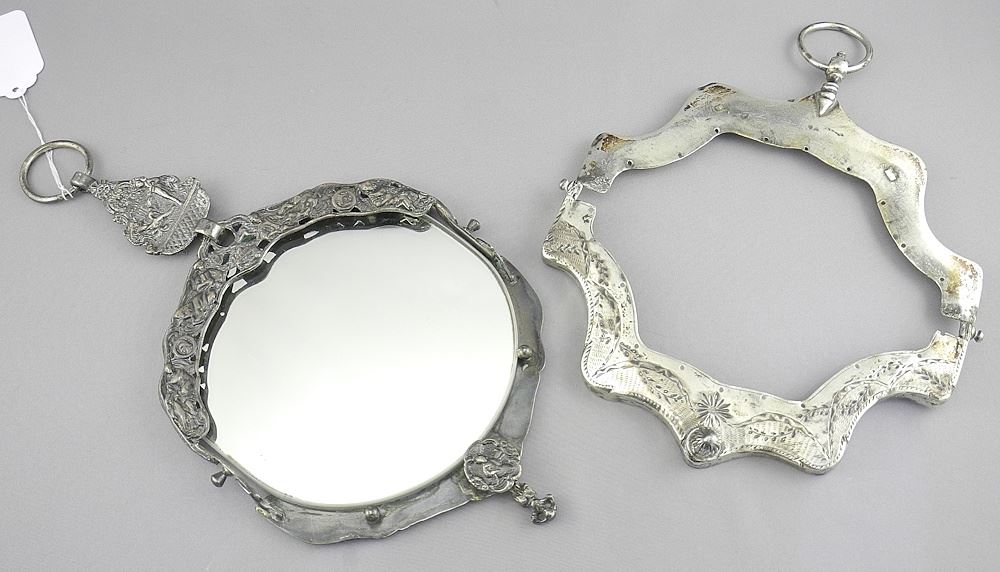 LOT 86 Two Dutch Silver (marked) Purse Clasps Repurposed as Mirror Frames, 305g. Estimate: $500 - $600 Sold For: $500 Auction Date: Tuesday, February 10 2026 at 4:00 PM