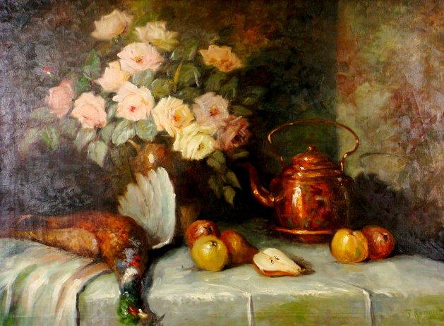 Oil painting on canvas after Renoir, 27"x 39", "Still Life with Pheasant"