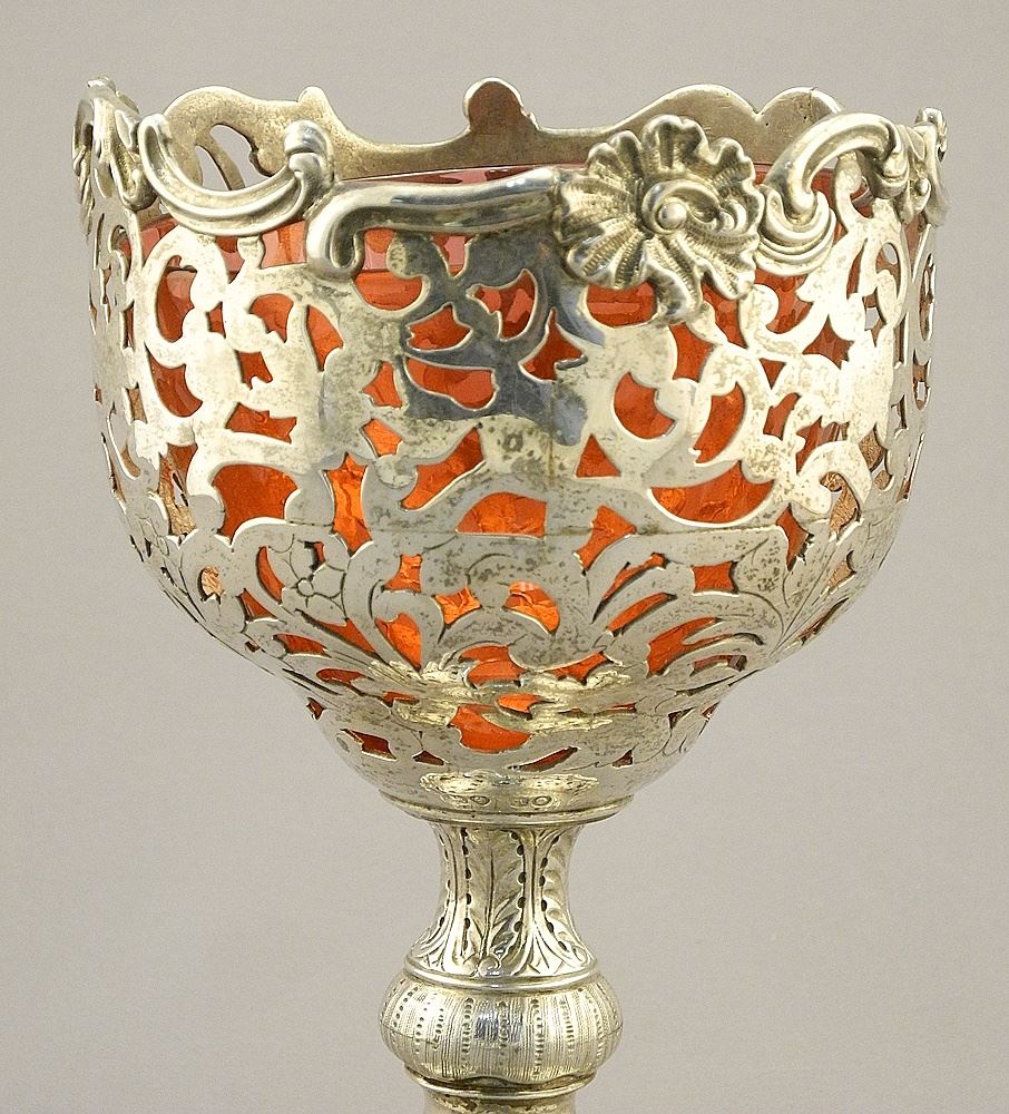 LOT 104 Hallmarked Silver Pierced Sweetmeat Dish with Cranberry Liner. Estimate: $70 - $90 Sold For: $180 Auction Date: Tuesday, September 19 2023 at 4:00 PM