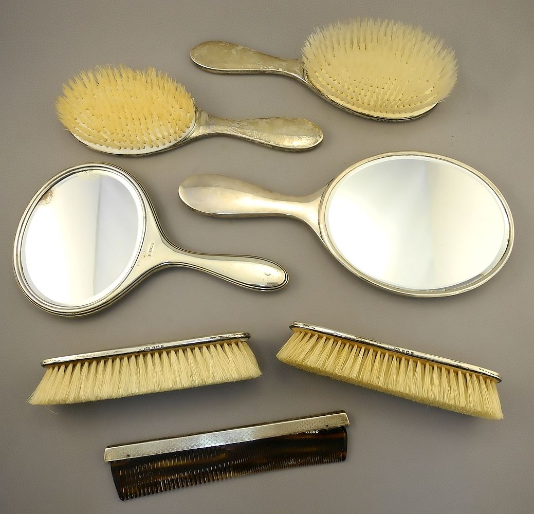 Collection of Sterling Dressing Table Items; 5 Brushes & Comb, 2 Mirrors, appr.1100 grams.