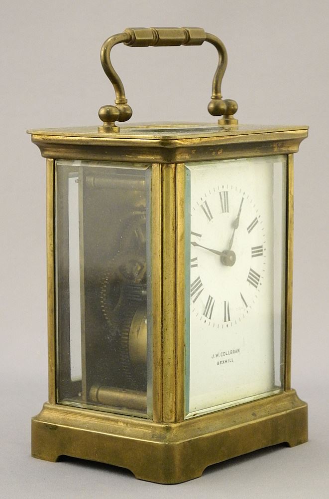 LOT 95 Brass Carriage Clock, Dial Signed J.W. Collbran Bexhill, 4 1/4"H, (case as found). Estimate: $80 - $100 Sold For: $60 Auction Date: Tuesday, September 19 2023 at 4:00 PM