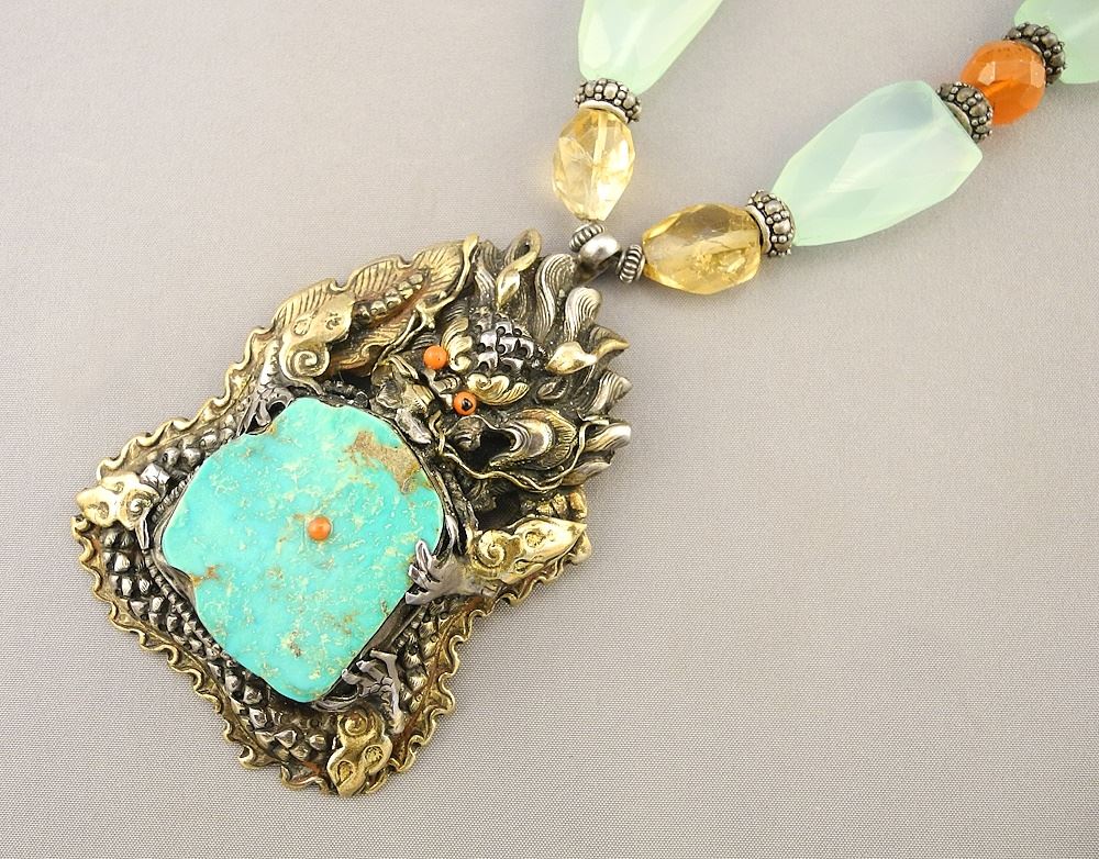 Tibetan Gilt Silver and Turquoise Pendant on Semiprecious Stone Necklace with 925 Clasp,17