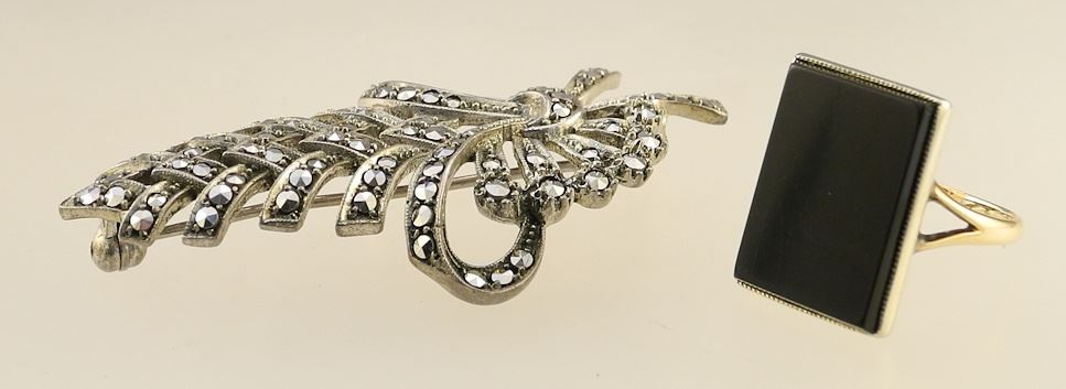 LOT 108 14K (marked) Yellow Gold and Black Zircon Ring, Size 6 1/2, with a Marcasite Brooch. Estimate: $80 - $120 Sold For: $70 Auction Date: Tuesday, September 19 2023 at 4:00 PM
