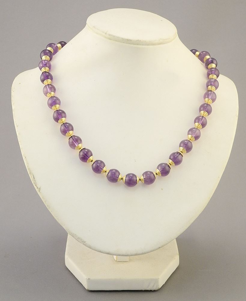 LOT 137 Uniform Amethyst Bead Necklace with Gold-Tone Spacers & 14K Clasp, 16" Long Estimate: $60 - $100 Sold For: $70 Auction Date: Tuesday, September 19 2023 at 4:00 PM