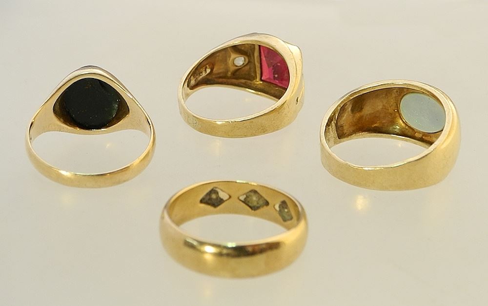 LOT 109 4 x 10K(marked) Gold Rings, TW 19.5 grams. Estimate: $500 - $600 Sold For: $600 Auction Date: Tuesday, September 19 2023 at 4:00 PM