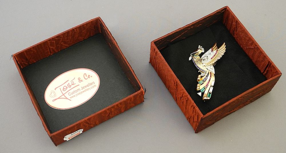 18K (tested) Rose Gold & Platinum Ruby Diamond Emerald Bird of Paradise Brooch.