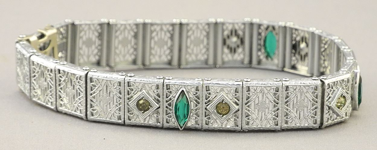 LOT 123 Silver Metal Bracelet with Green Stones, TW 13.14 grams. Estimate: $50 - $80 Auction Date: Tuesday, September 19 2023 at 4:00 PM