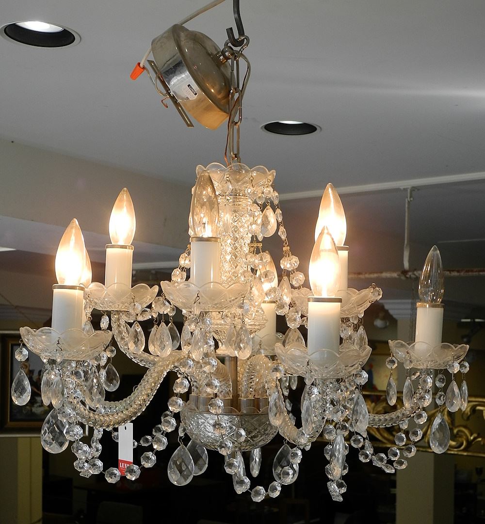 LOT 89 8 Branch Cased Glass Arm Chandelier, 22" diam, (September). Estimate: $100 - $200 Sold For: $90 Auction Date: Tuesday, September 19 2023 at 4:00 PM