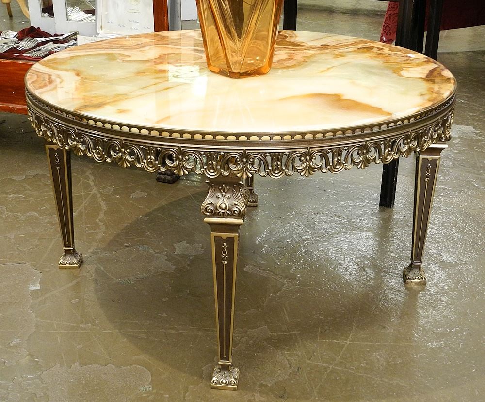 LOT 252 Onyx & Cast Brass Low Table, 18 5/8 x 33 3/8" Diam. & Similar Lamp Table 19 x 20 1/4 x 20 1/4". Estimate: $100 - $200 Sold For: $180 Auction Date: Tuesday, September 19 2023 at 4:00 PM