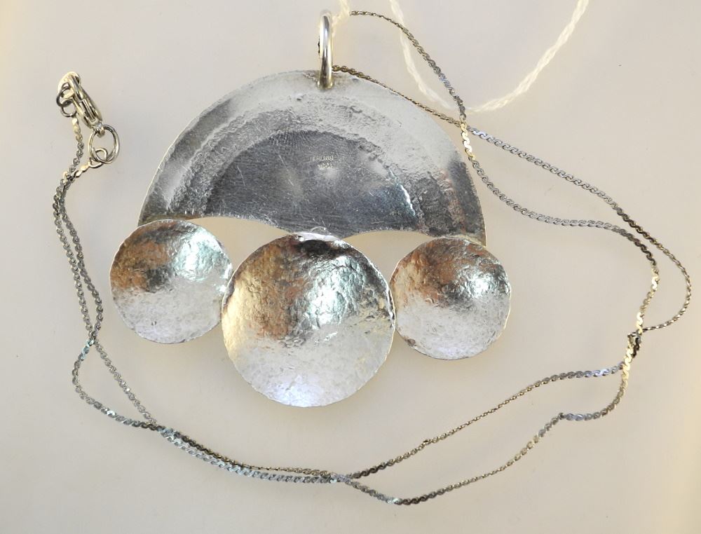 LOT 202 Modernist Textured Sterling Silver Pendant & Chain, Pendant 2 3/4", Chain 20". Estimate: $60 - $100 Sold For: $50 Auction Date: Tuesday, September 19 2023 at 4:00 PM