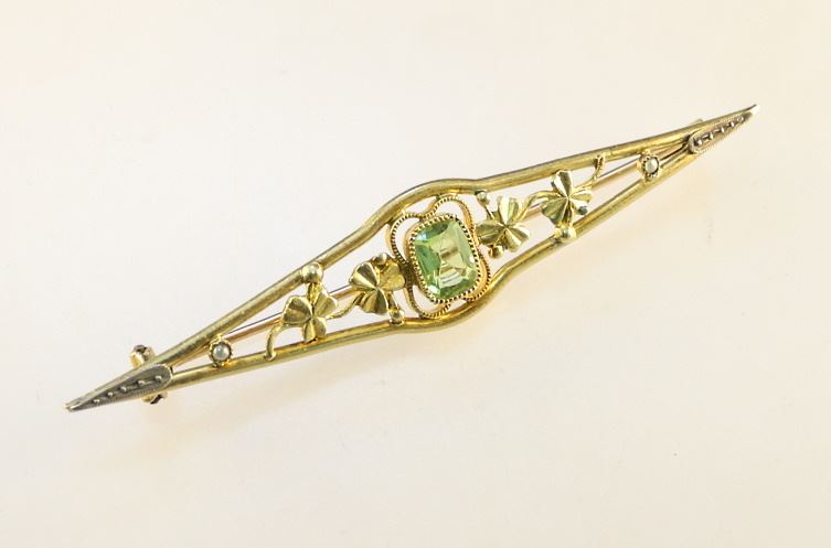 Hallmarked 14K & Peridot Brooch with Shamrock Decorations.