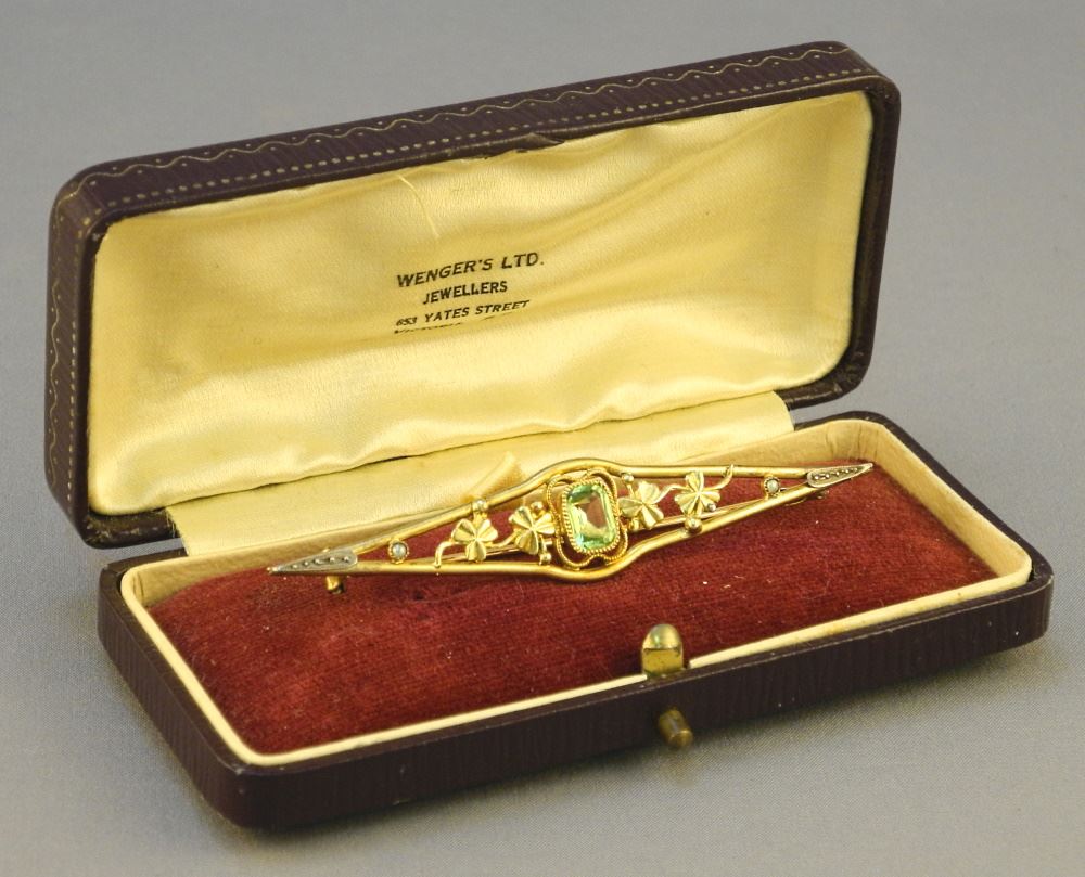LOT 125 Hallmarked 14K & Peridot Brooch with Shamrock Decorations. Estimate: $200 - $300 Auction Date: Tuesday, September 19 2023 at 4:00 PM
