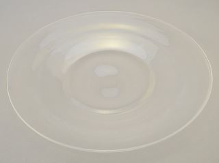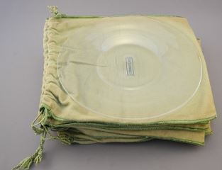 6 Steuben Clear Glass Plates with Original Steuben Cloth Bags, 8 1/2" Diameter