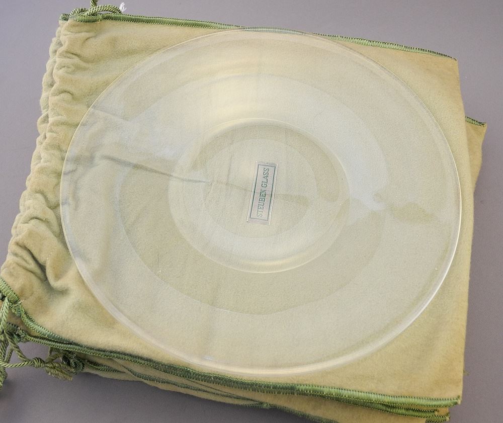 LOT 226 6 Steuben Clear Glass Plates with Original Steuben Cloth Bags, 8 1/2" Diameter Estimate: $200 - $300 Sold For: $100 Auction Date: Tuesday, September 19 2023 at 4:00 PM