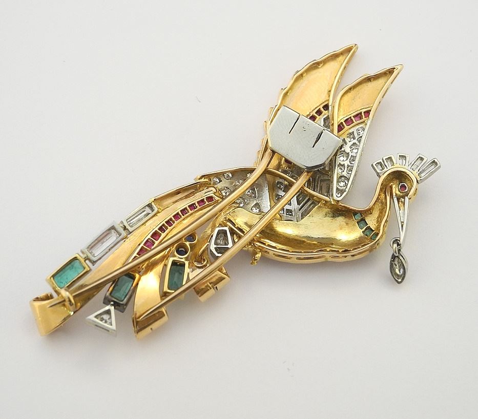 18K (tested) Rose Gold & Platinum Ruby Diamond Emerald Bird of Paradise Brooch.