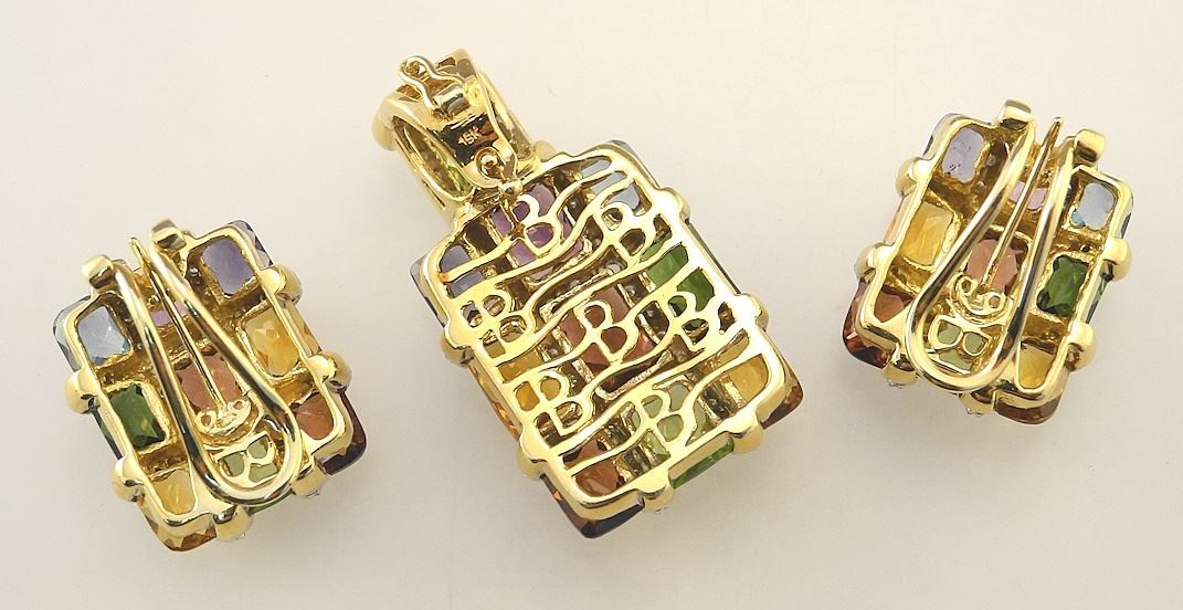 LOT 12 Bellarri 18K Yellow Gold & Mosaic Gemstone Earrings & Pendant. Estimate: $1,500 - $3,000 Sold For: $1,400 Auction Date: Tuesday, February 13 2024 at 4:00 PM